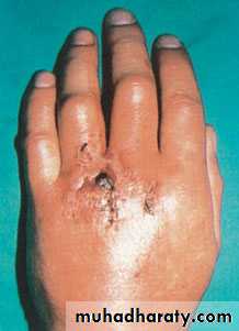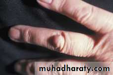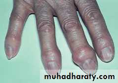 the distal part of the finger may be painful, swollen and cyanotic, or sometimes threatened with amputation