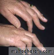 The joints are swollen and tend to deviate ulnarwards due to mechanical pressure in daily activities.