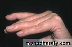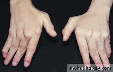 Early deformity : slight radial deviation of the wrist and ulnar deviation of the fingers, correctable swanneck deformities of some fingers, an isolated boutonnière or the sudden appearance of a drop-finger or mallet thumb (from extensor tendon rupture).
