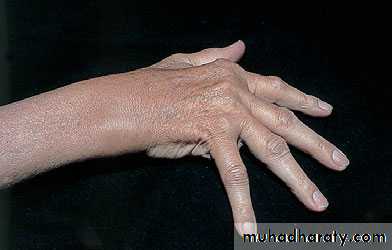 swelling of the MCP and PIP joints, giving the fingers a spindle shape;