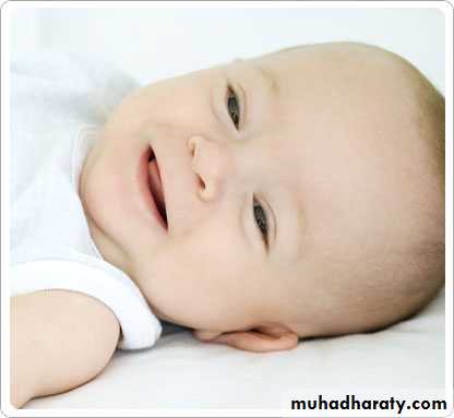 The baby regards faces by 1 month, has social smile by 6 weeks and recognizes the mother and caretakers by 3 months, can laugh loudly by 4 months.