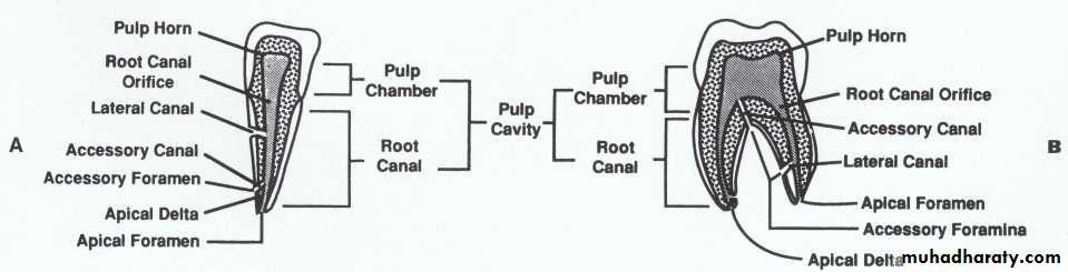 Root canal: is continuation of the pulp chamber inside the root start from canal orifice and terminate in the apical canal area.accessory canals: Lateral branching of the main canal located in the apical third of the root , at furcation of multirooted teeth.Lateral canal: Can be found any where along the length of a root at right angle to the main root canal.