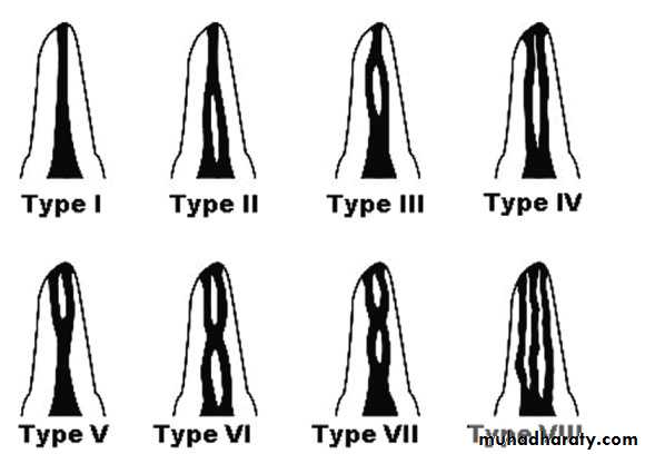 Type V: One root canal bifurcation in apical third & open in two apical foramen.
