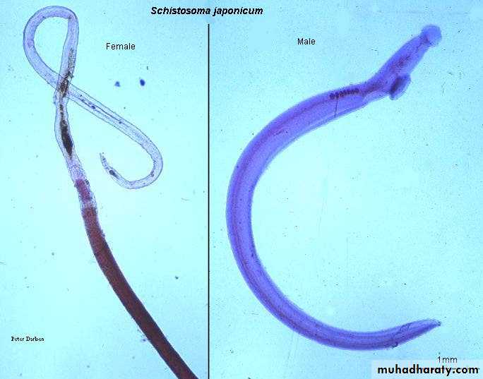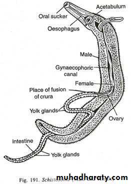 Separate male and female worms exist in this group of flukes.The female is long and narrower, the male is shorter, cylindrical and has characteristic ventral groove to form a gynecophoral canal in which the female embeded during copulation.
