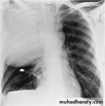 manifests as airspace shadowing that abuts the right hemidiaphragm,
