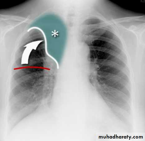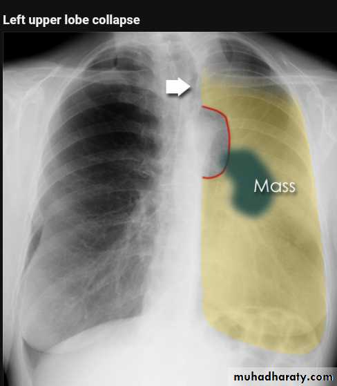 Collapse of the right upper lobe is usually relatively easy to identify on frontal radiographs. Features consist of :