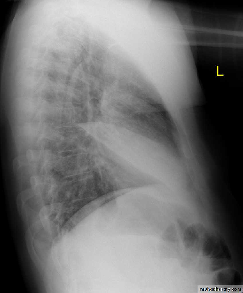 On lateral projection the left hemidiaphragmatic outline is lost posteriorly and the lower thoracic vertebrae appear denser than normal (they are usually more radiolucent than the upper vertebrae) .