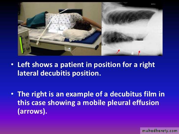 A lateral decubitus film (obtained with the patient lying on their side, effusion side down, with a cross table shoot through technique) can visualise small amounts of fluid layering against the dependent parietal pleura.