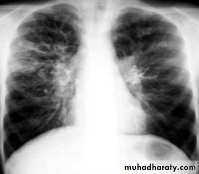 1.patchy consolidation or poorly defined linear and nodular opacities in both apices , upper zone in one lung , & lower zone in other lung ( ulternating lesion ) .2. Post-primary infections are far more likely to cavitate with multiple abscess formation & air fluid level more develop in the posterior segments of the upper lobes.