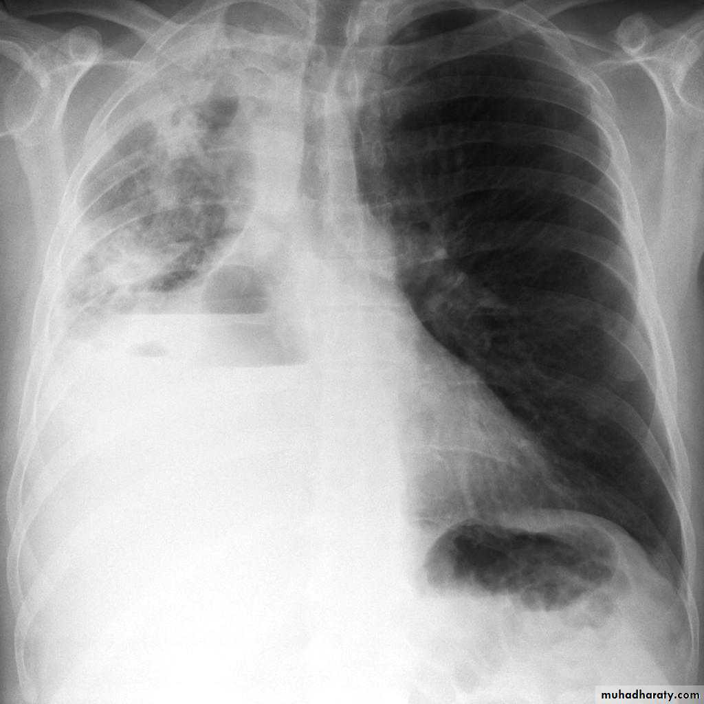 2.Lobar collapse may be seen due to obstruction of a bronchus. When the right upper lobe is collapsed and a hilar mass is present, this is known as the Golden S sign.