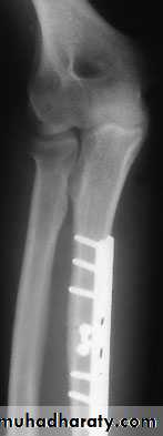 compression with plates and screws. Bone grafting is advisable if there is comminution.