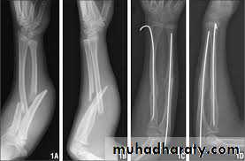Occasionally an operation is required, either if the fracture cannot be reduced or if the fragments are unstable. Fixation with intramedullary rods is preferred, but they should be inserted with great care to avoid injury to the growth plates. Alternatively, a plate or K-wire fixation can be used.