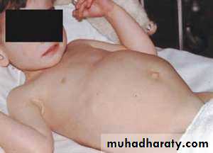 Predominantly newborn infants and young children (< 5 years of age) are affected. Symptoms are caused by a mass in the abdomen or by metastases )70%(with proptosis, bone pain, painless bluish skin secondaries, weakness or paralysis.