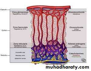 The outer zona glomerulosa produce aldosterone, that regulates sodium–potassium homeostasis .The zona fasciculata produce Cortisol that has numerous metabolic and immunological effects.