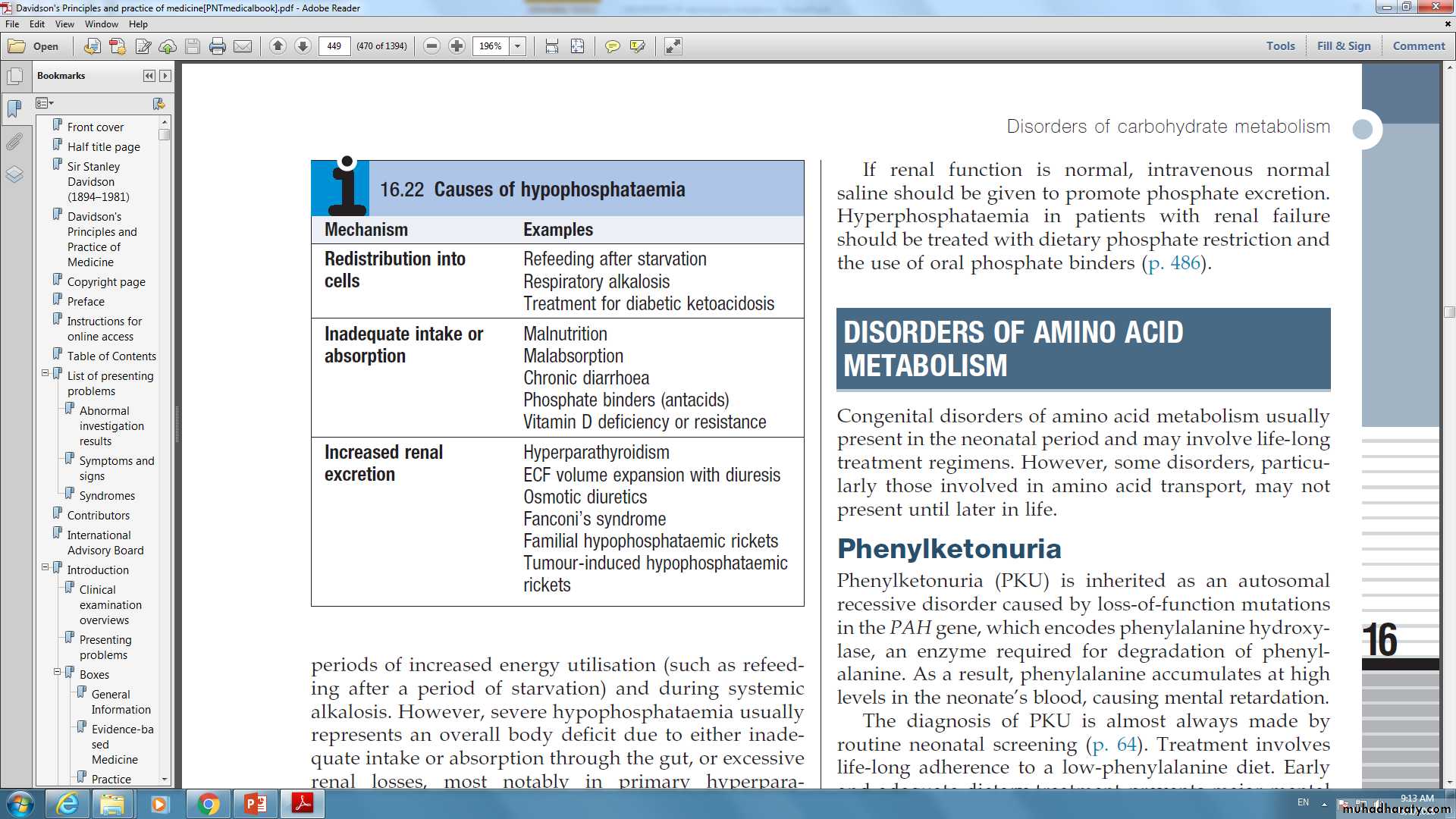 Phosphate accumulation is usually the result of acute kidney injury or chronic kidney disease ,phosphate excretion is also reduced in hypoparathyroidism and pseudohypoparathyroidism ,redistribution of phosphate from cells into the plasma can also be a contributing factor in the ‘tumor lysis’ syndrome and in catabolic states.The clinical features relate to hypocalcaemia and metastatic calcification, particularly in chronic renal failure with tertiary hyperparathyroidism (when a high calcium–phosphate product occurs).