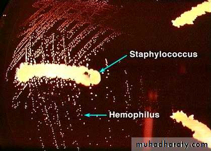 • around the growth of Staphylococcus aureus (or Strep. pneumoniae or Neisseria gonorrhoeae) the colonies of H. influenzae will be larger. This is because the former growth provides an extra amount of V factor which enhances the size of the colonies of the latter m.o.