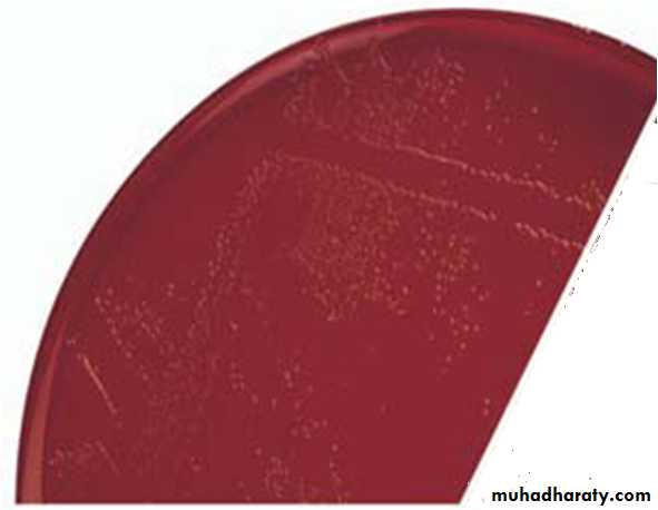The colonies appear as rounded, convex,1-2 mm in diameter, and look like mercury drops or pearl-appearance. The colonies have iridescence and surrounded by narrow zones of haemolysis