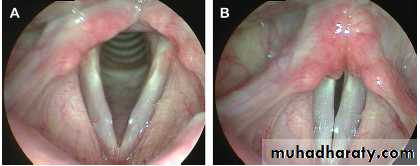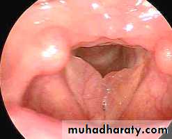 On examination: by a mirror or flexible endoscopy might shows the presence of a mass or ulcerative lesion . The vocal cords mobility should be assessed.
