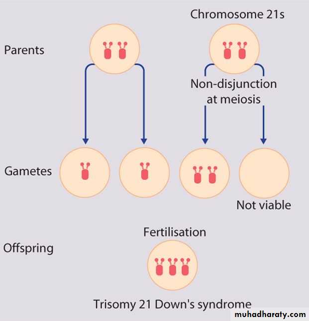 In mosaicism some of the cells are normal and some have trisomy 21. This usually arises after the formation of the zygote, by non-disjunction at mitosis. The phenotype may be milder in mosaicism.