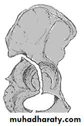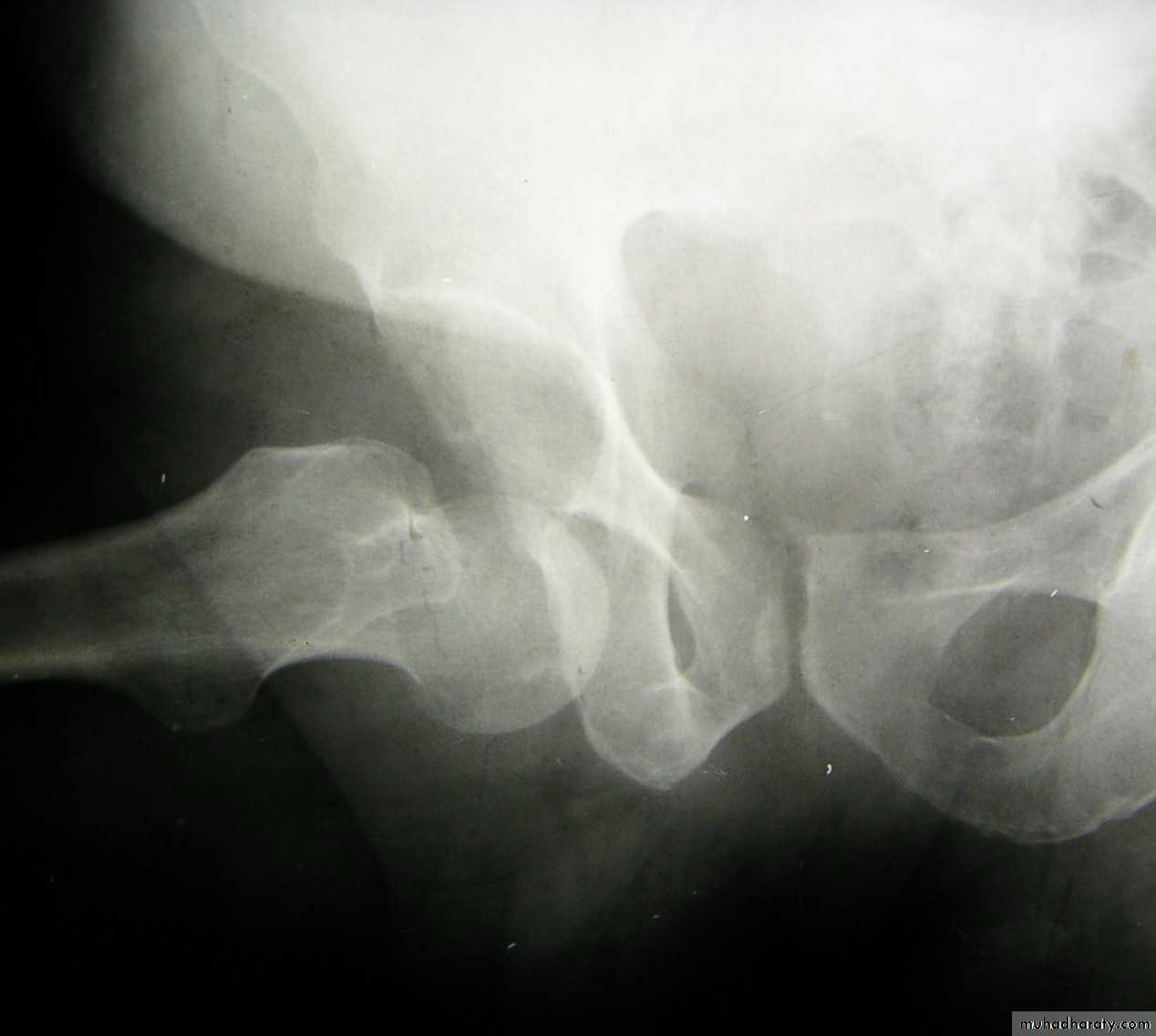 The femoral head tilted out of position and the trabecular marking are not in line with those of innominate bone.