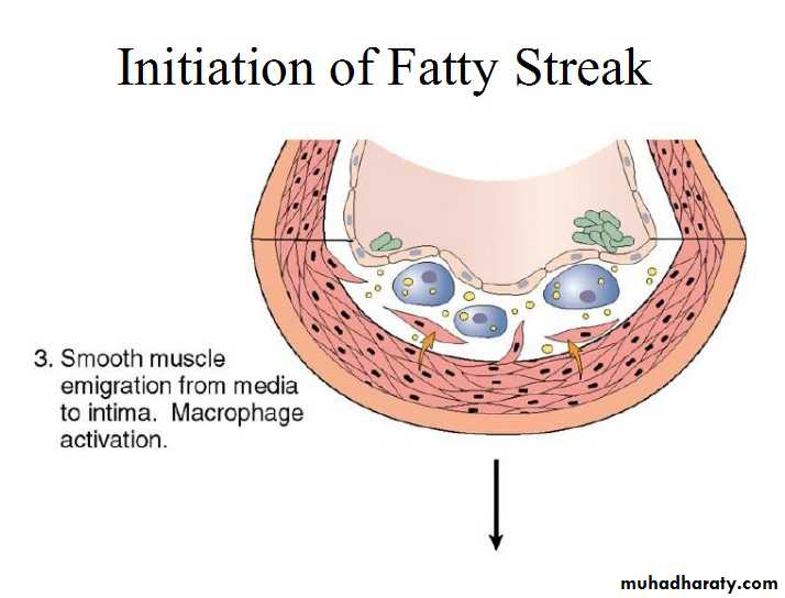 Atherosclerosis can begin in childhood but is typically asymptomatic for decades until it finally manifests as the following :• Insidious narrowing of vascular lumens (e.g. gangrene of the lower leg because of stenosing atherosclerosis in the popliteal artery).