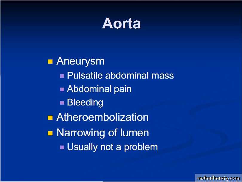 Abdominal aortic aneurysm (AAA):Is a localized abnormal dilation of a blood vessel, it is due to atherosclerosis, which may involve also the" common iliac arteries, aortic arch and descending part of thoracic aorta.