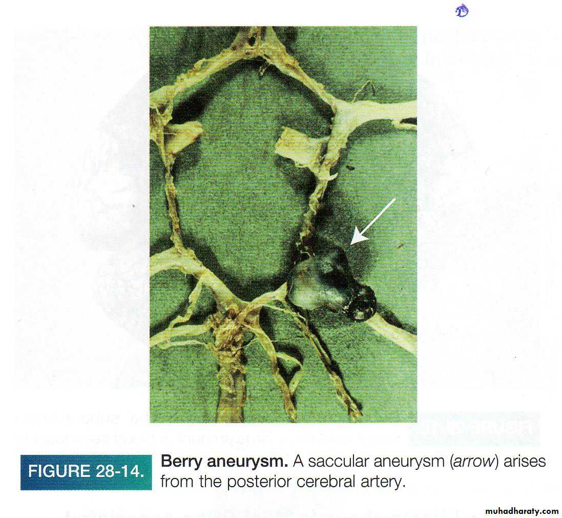 2- Berry Aneurysms, are saccular congenital of unknown etiology seen in smaller arteries of the brain especially in the circle of Willis: