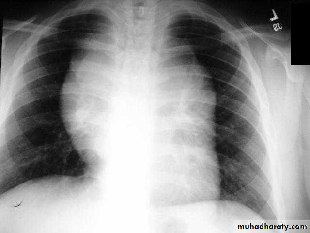 It may show a superior mediastinal radio-opacity causing the deviation of trachea to opposite site. The superior margin of the radio-opacity/mass is untraceable (cervicothoracic sign).