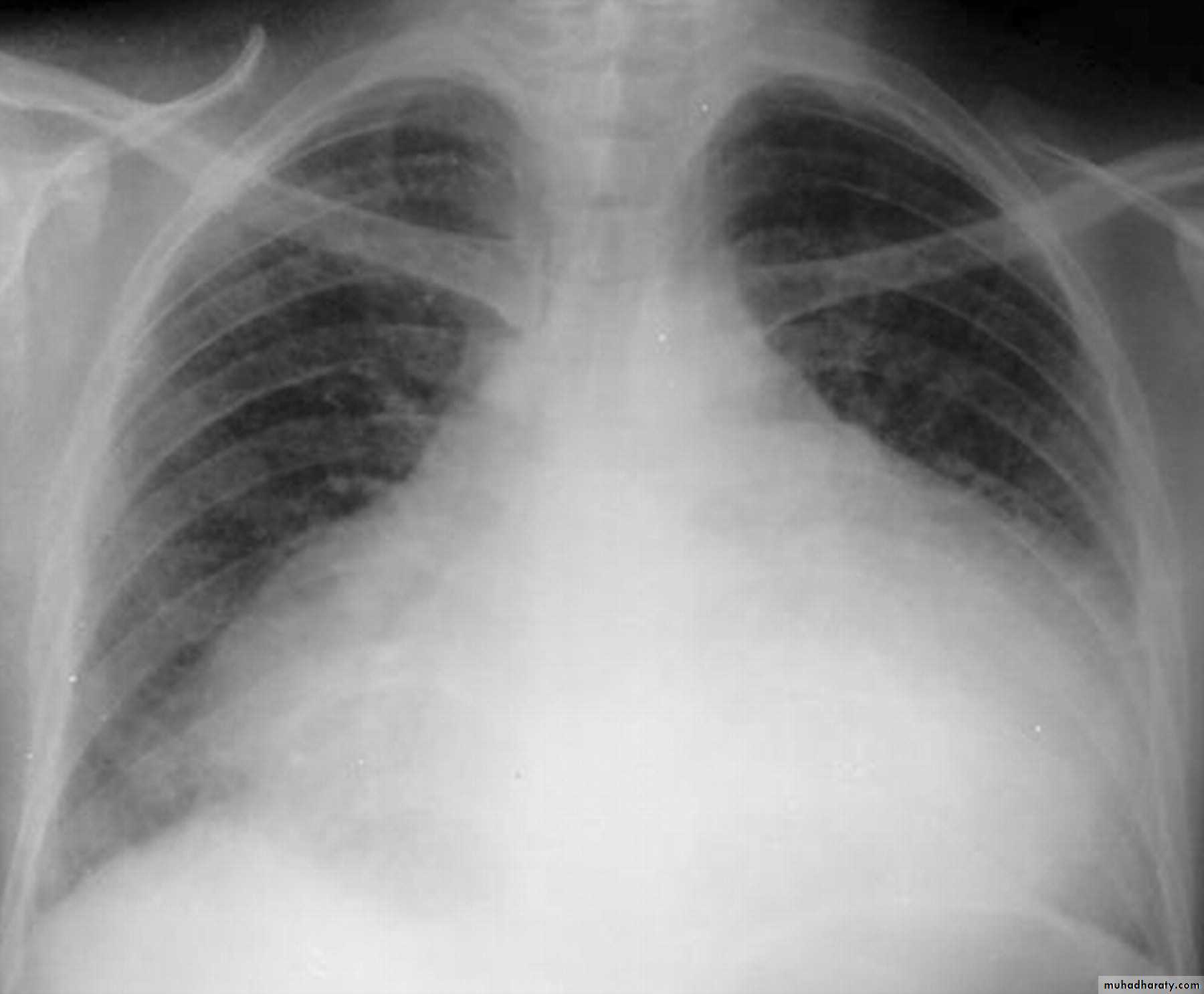 there can be globular enlargement of the cardiac shadow giving a water bottle configuration known as Globe shape heart or pumpkin shape heart .