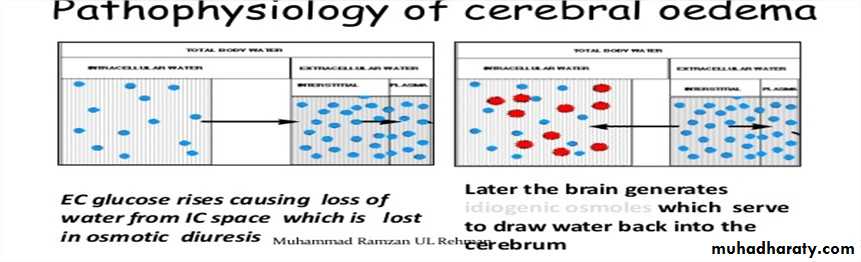 The cause of cerebral edema in DKA is not known, but there are somerisk factors attributed to cerebral edema. These include: young age. Rapid fluid replacement & insulin infusion. Injudicious use of bicarbonate therapy. Severe presentation: pH < 7.2 lower serum bicarbonate concentration higher serum glucose concentration higher blood urea nitrogen concentration hypernatremiaCLINICAL FEATURES severe headache. sudden deterioration in mental status. bradycardia (or a sudden, persistent drop in heart rate notattributable to improved hydration). Hypertension. depressed respiration cranial nerve dysfunction. posturing, and seizures incontinence. Papilledema is a late sign.TREATMENT The 1st thing to be excluded is hypoglycemia. Mannitol 0.5g/kg is infused over 30-60 min & can repeated if necessary. Fluid restricted to 2/3 maintenance & the total correction should madeover 48-72hrs. If the patient requires intubation, hyperventilation should be avoided, asit has been shown to be associated with worse outcomes