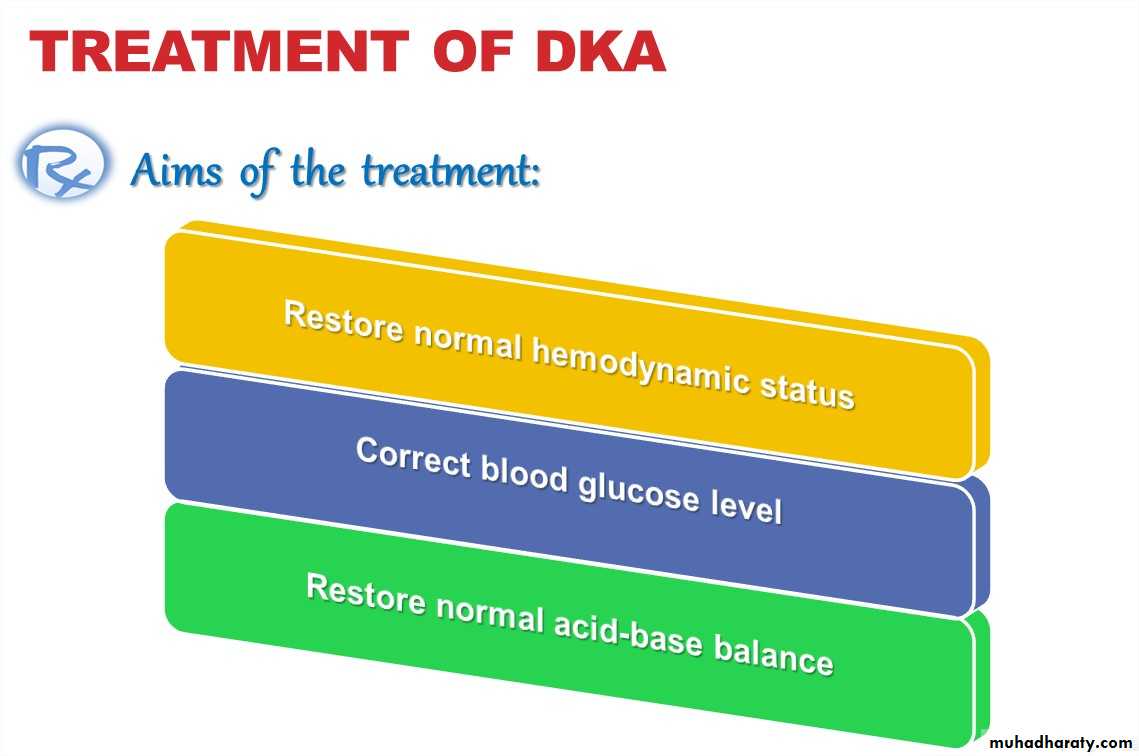 Restore perfusion by giving fluids, which will increase glucose usein the periphery, restore GFR, and reverse the progressive acidosis. Stop ketogenesis by giving insulin, which will reverse proteolysisand lipolysis, and stimulate glucose uptake and processing,normalize blood glucose, and reverse acidosis. Correct electrolyte losses by electrolyte supplementation. Avoid the complications of treatment, including intracerebralcomplications, hypoglycemia, and hypokalemia.