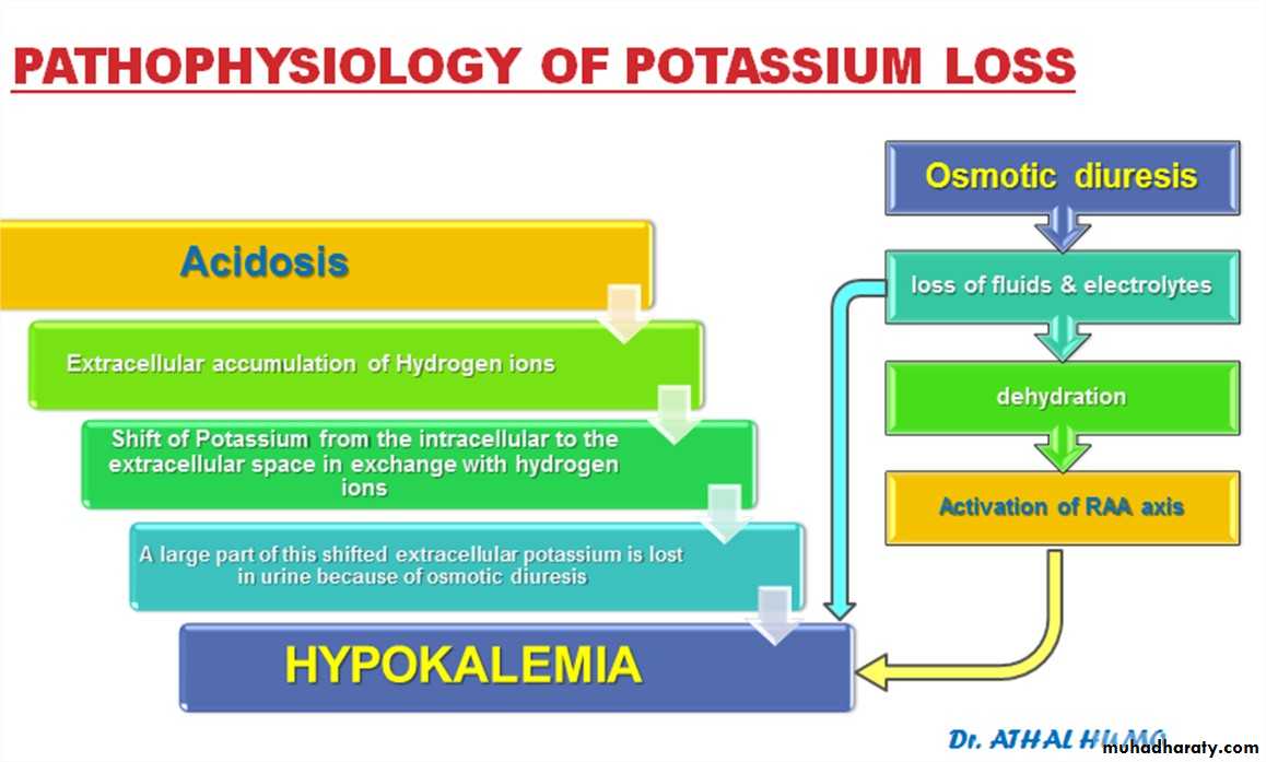 POTASSIUM The most characteristic disturbance in electrolytes is total body potassium loss. K+ is largely an intracellular ion. Both lack of insulin (catabolic predominance) and acidosis cause a shift of K+extracellularly. High urinary losses of K+ occur due to: compartmental shift. osmotic diuresis. kaliuretic effect of hyperaldosteronism. This loss is not mirrored in serum potassium levels, which may be low, withinthe normal range, or even high. Serum K+ levels are usually normal, even when total body K+ is depleted,because: The compartmental shift of K+ from inside to outside the cell Only extracellular K+ is measured