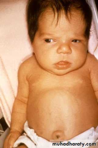 The abdomen is large, and an umbilical hernia is usually present.