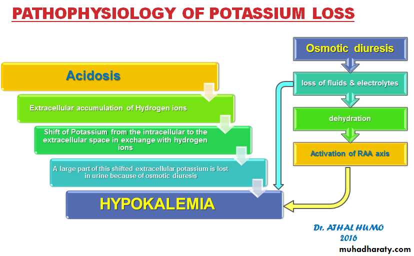 • Both lack of insulin (catabolic predominance) and acidosis cause a shift of K+ extracellularly.