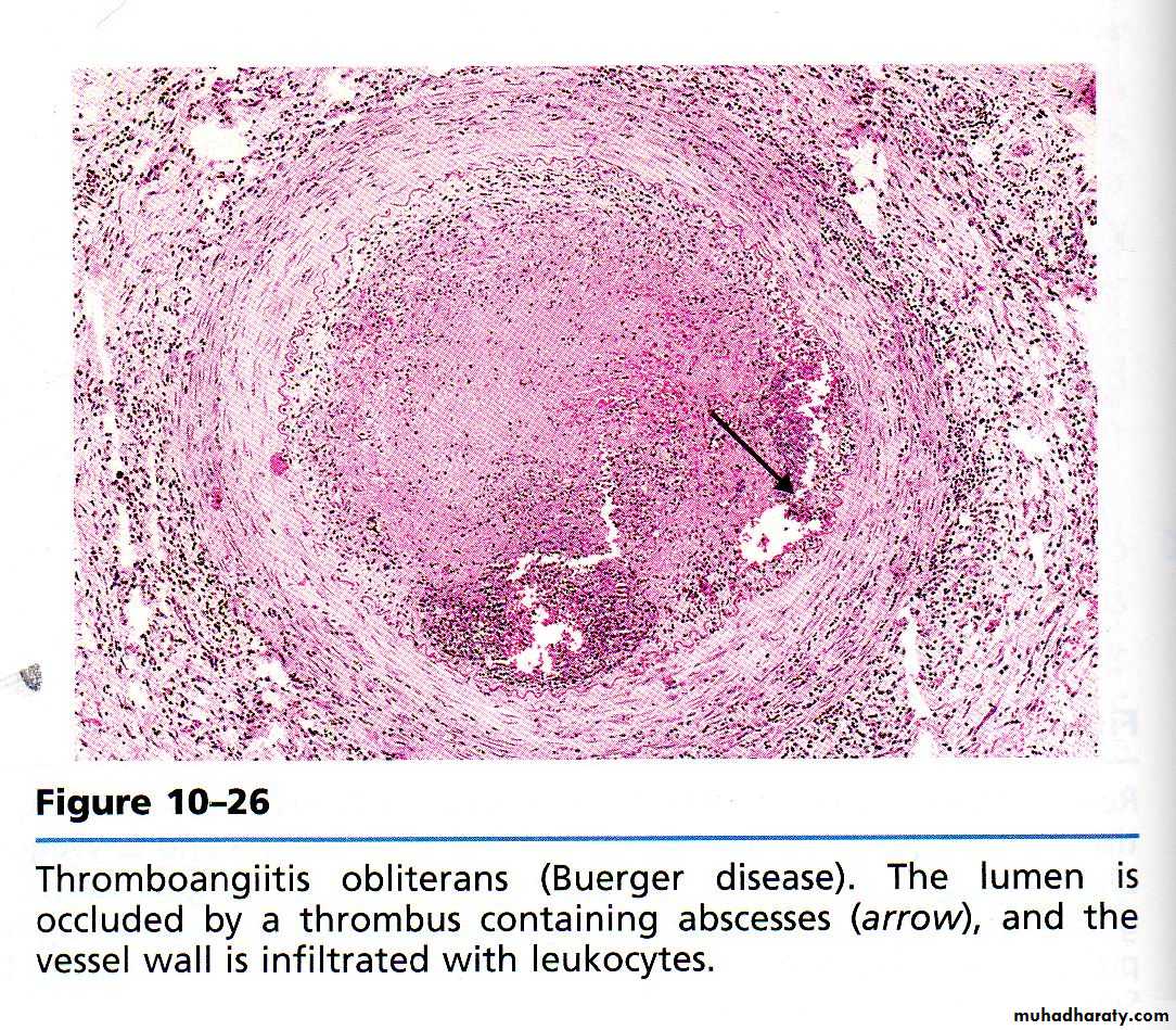 Segmental thrombosing acute and chronic inflammation of medium-sized and small arteries principally tibial and radial arteries with secondarily involvement of the adjacent veins and nerves. Starts in patients younger than 35 years in most of the cases.
