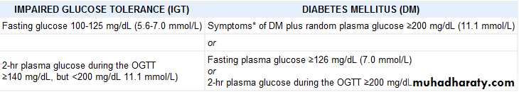*OGTT: 2 hr plasma glucose is obtained after1.75g/kg glucose(maximum of 75g) is ingested orally in the fasting state.