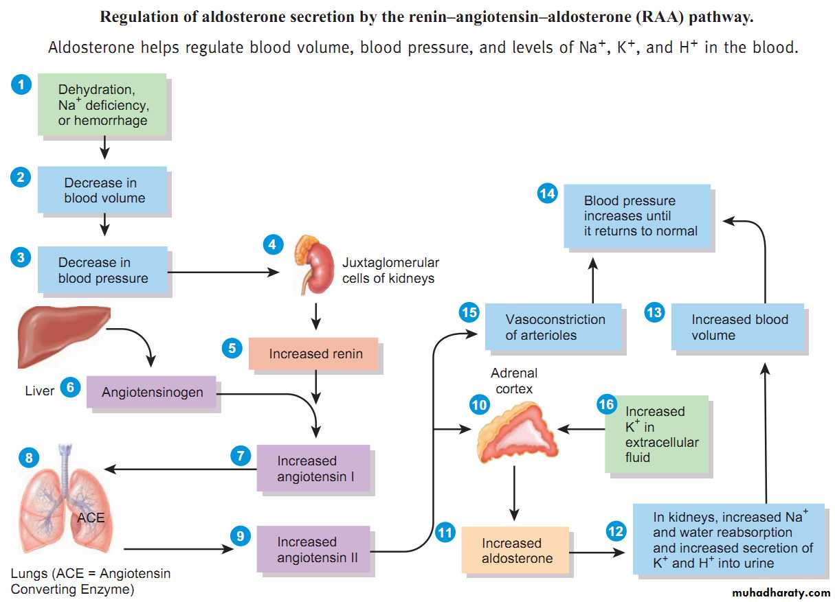 1- Adrenal cortex : stimulates synthesis and secretion of aldosterone which acts on the principal cells of the renal distal tubule and collecting duct to increase Na+ reabsorption and, thereby, to increase ECF volume and blood volume.