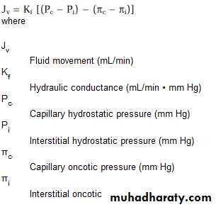 • The Starling equation states that fluid movement (Jv) across a capillary wall is determined by the net pressure across the wall, which is the sum of hydrostatic pressure and oncotic pressures. The direction of fluid movement can be either into or out of the capillary. When net fluid movement is out of the capillary into the interstitial fluid, it is called filtration; when net fluid movement is from the interstitium into the capillary, it is called absorption. The magnitude of fluid movement is determined by the hydraulic conductance, Kf (water permeability), of the capillary wall. The hydraulic conductance determines how much fluid movement will be produced for a given pressure difference.