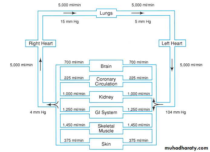 • - The flow through each organ is a fraction of the total blood flow, and there is no loss of pressure in the major arteries and that mean pressure in each major artery will be approximately the same as mean pressure in the aorta.