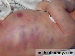 Easy bruising skin, with thinning of the skin.