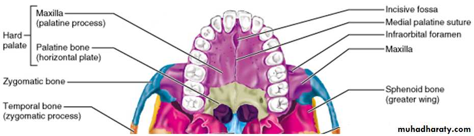 Hard Palate. The hard palate is made up of the anterior two-thirds of the palatal vault supported by bone (palatine processes of the maxillae and the horizontal plates of the palatine bones).
