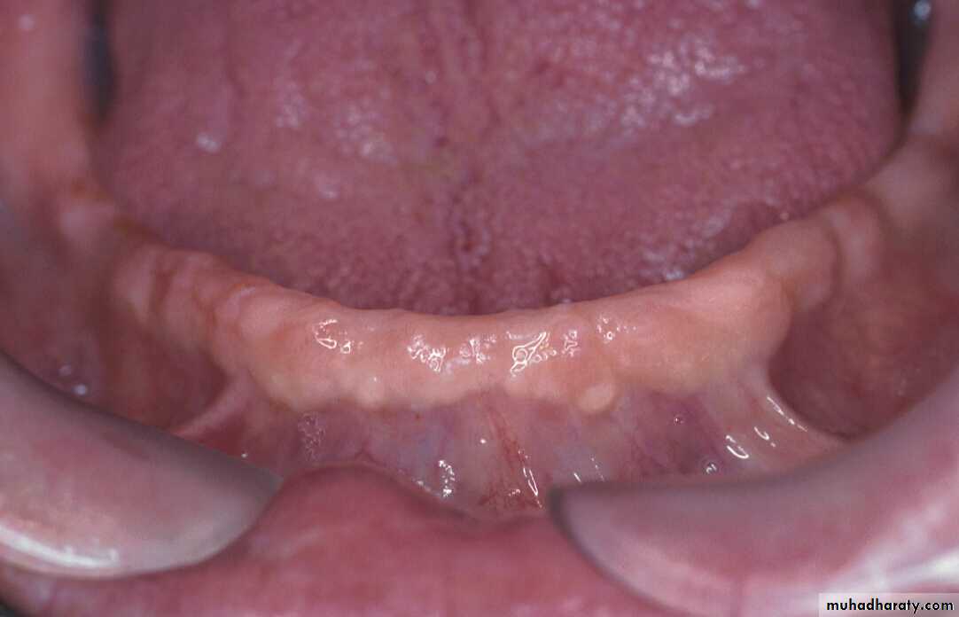 The labial and buccal frena of the mandible are in corresponding position parallel in the upper jaw. Also, a lingual frenum can be seen in the floor of the mouth when the tongue is raised. The lingual frenum is present in the approximate midline and extends from the floor of the mouth to the lingual surface of the alveolar ridge.
