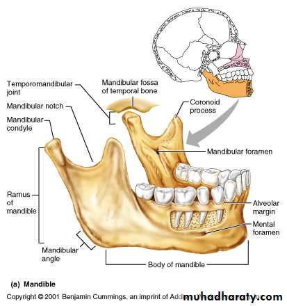 The external oblique ridge extends at an oblique angle across the external surface of the body of the mandible. This ridge begins at the lower anterior edge of the ramus, continues onto the body, and progressively thins out to end near the mental foramen.The significant internal landmarks of the mandible