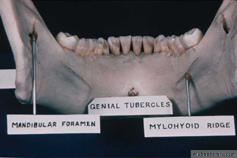 Mylohyoid Ridge. Located on the internal surface of the mandible, the mylohyoid ridge occupies a position similar to the external oblique ridge on the external surface. The mylohyoid ridge passes forward and downward from the internal aspects of the ramus onto the body of the mandible and fades out near the midline. This ridge serves as the lateral line of origin for the mylohyoid muscle (the mylohyoid muscle forms the major portion of the floor of the mouth).Genial Tubercles. Slightly above the lower border of the mandible in the midline, the bone is elevated to a more or less sharply defined prominence forming the genial tubercles.