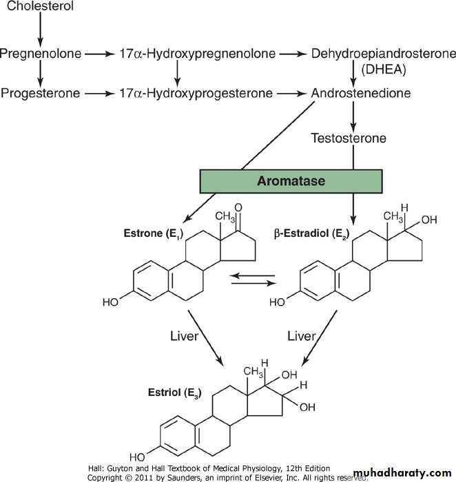 Figure 81-6 Synthesis of the principal female hormones. The chemical structures of the precursor hormones, including progesterone, are shown in Figure 77-2.