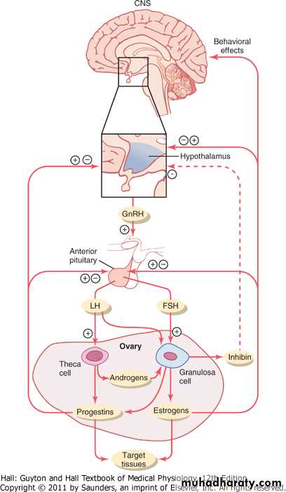 Figure 81-10 Feedback regulation of the hypothalamic-pituitary-ovarian axis in females. Stimulatory effects are shown by + and negative feedback inhibitory effects are shown by -. Estrogens and progestins exert both negative and positive feedback effects on the anterior pituitary and hypothalamus depending on the stage of the ovarian cycle. Inhibin has a negative feedback effect on the anterior pituitary. FSH, follicle-stimulating hormone; GnRH, gonadotropin-releasing hormone; LH, luteinizing hormone.