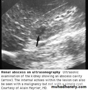 - Cavitating lesions in the renal papillary areas, commonly with calcification.