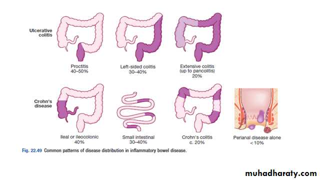 The sites most commonly involved are, in order of frequency, the terminal ileum and right side of colon, colon alone, terminal ileum alone, ileum and jejunum.The entire wall of the bowel is edematous and thickened, and there are deep ulcers which often appear as linear fissures; thus the mucosa between them is described as ‘cobblestone’.