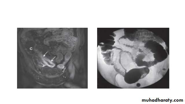 Barium enema is a less sensitive investigation than colonoscopy in patients with colitis and, where colonoscopy is incomplete, a CT colonogram is preferred.Small bowel imaging is essential to complete staging of Crohn’s disease. Traditional contrast imaging by barium follow-through demonstrates affected areas of the bowel as narrowed and ulcerated, often with multiple strictures. This has now largely been replaced by MRI enterography, which is a sensitive way of detecting extra intestinal manifestations and of assessing pelvic and perineal involvement.