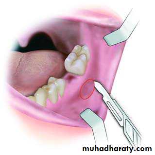 Treatment of mandibular cyst with marsupialization method. Circular incision includes mucosa and periosteum